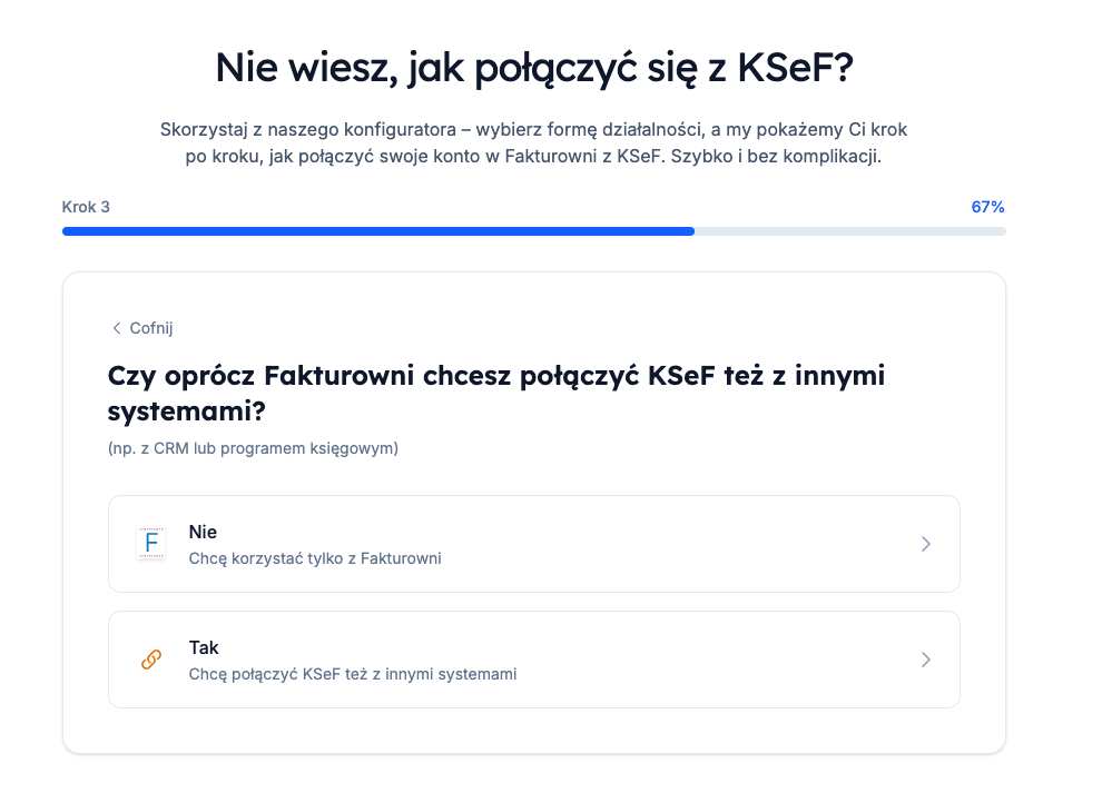 Aby ułatwić użytkownikom odpowiedź na to pytanie i wesprzeć ich podczas łączenia Fakturowni z KSeF, przygotowaliśmy specjalny konfigurator, który po udzieleniu odpowiedzi na kilka prostych pytań, wyświetla użytkownikowi instrukcję autoryzacji dostosowaną do jego indywidualnego przypadku.