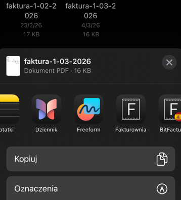W ramach aplikacji mobilnej Fakturowni dodaliśmy opcję, dzięki której jeszcze szybciej dodasz fakturę kosztową do zakładki Wydatki. Kiedy zaznaczysz w telefonie zdjęcie lub PDF z fakturą i wybierzesz opcję “Udostępnij”, zobaczysz na liście aplikacji Fakturownię.