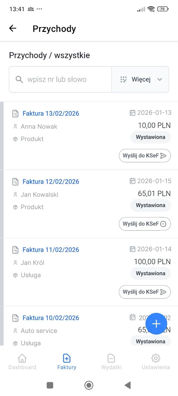 Wystawiaj e-faktury i wysyłaj je automatycznie do KSeF oraz pobieraj faktury zakupowe wprost z telefonu, bez konieczności osobnego logowania do KSeF i bez dodatkowych kosztów.