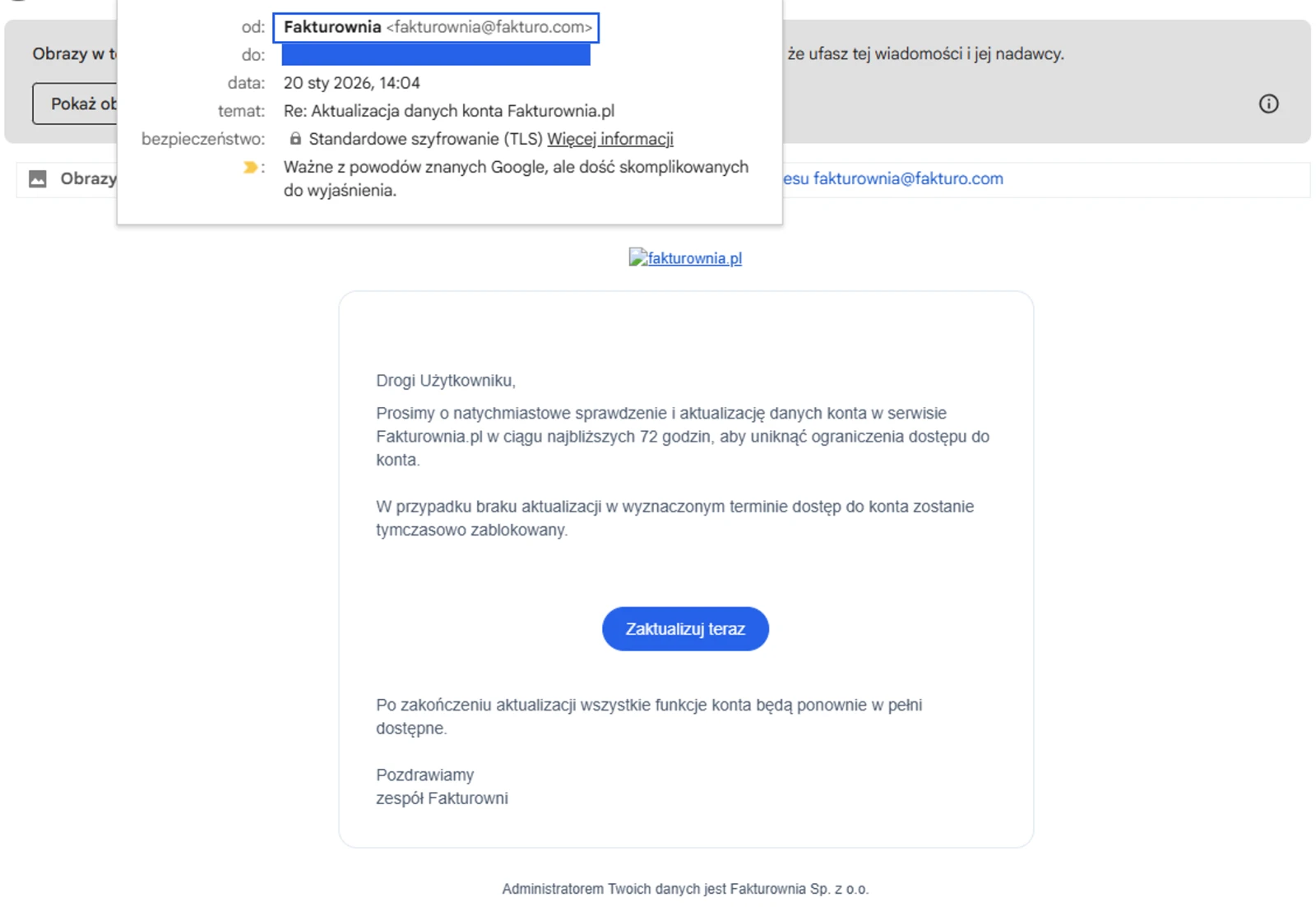W treści wiadomości znajduje się link do strony phishingowej imitującej stronę logowania do naszego systemu (hxxp://app-fakturownia.01pl.ink/auth/?konto=…). Prosimy: nie klikaj linków zawartych w treści wiadomości. Działanie oszustów ma na celu wyłudzenie Twojego loginu i hasła.
