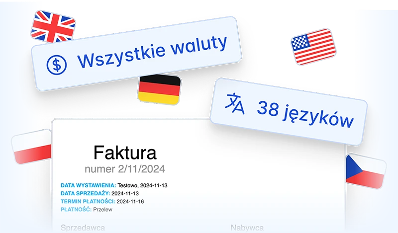Wystawiaj faktury w 38 językach i wszystkich walutach świata. Skorzystaj z opcji faktury dwujęzycznej, aby zarówno sprzedający, jak i kupujący dysponowali opisem danych w swoich językach.